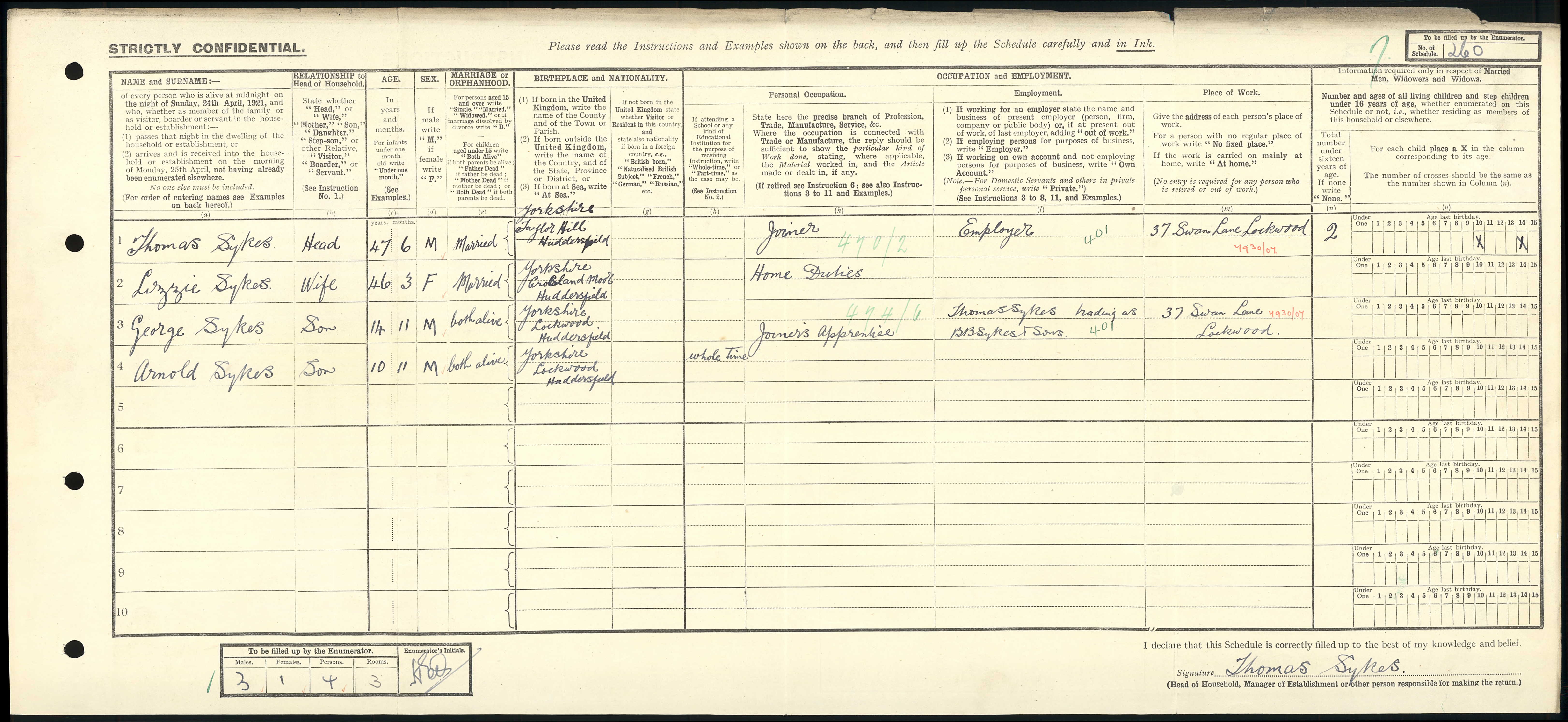 By 1911, Thomas was recorded as the head of the household and a “Master Joiner,” a sign that his skills and reputation had grown. The family continued to live in Lockwood at 35 Swan Lane, deeply rooted in the same community where both Thomas and Lizzie had spent their childhoods.
