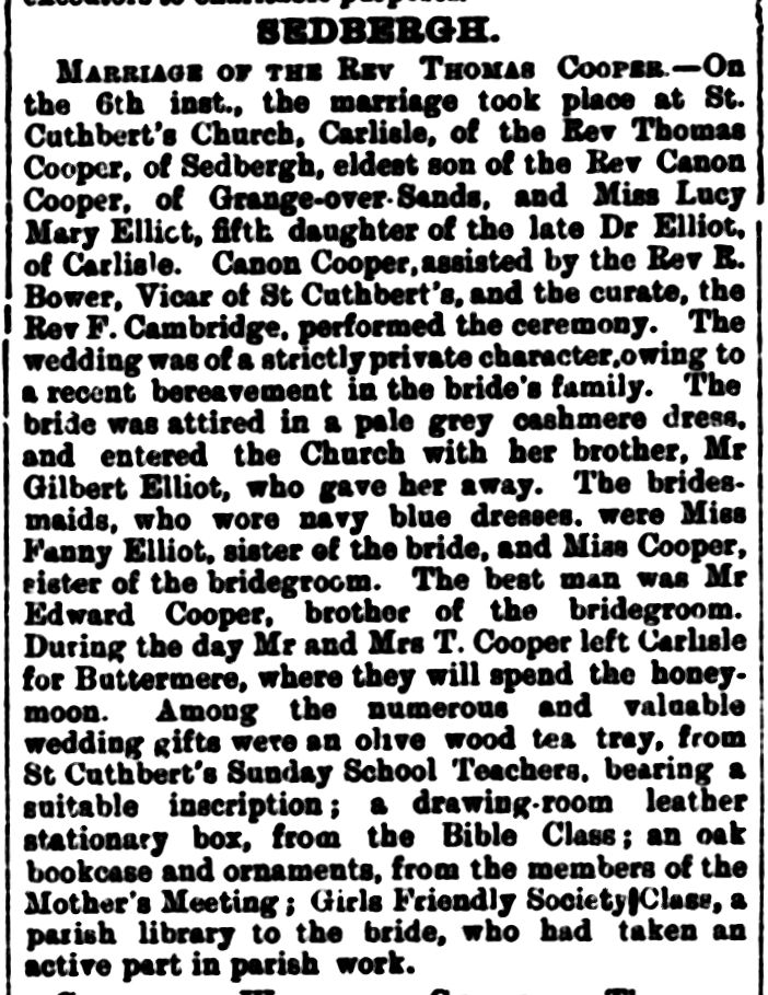 On 6 August 1889, in her hometown of Carlisle, Lucy married Thomas Cooper. He was 25; she was 27. Had she already met Thomas by the time of my photo in 1886? Their marriage marked the joining of two well-established northern families, one clerical, the other professional.