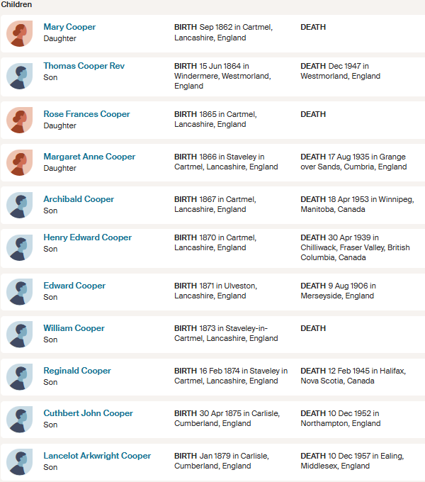His father was Vicar Thomas Cooper, born at Windermere in 1864, and his Grandparents were Thomas Cooper and Anne Arkwright.
