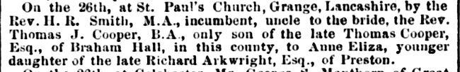 I began a family tree on Ancestry for the family with this information. Charles’s Grandfather was Rev Thomas John Cooper, 1837-1911, and Grandmother was Anne Eliza Arkwright, 1838-1902. Once again, the British Newspaper Archives on Find My Past were invaluable for family history information about the couple. They were married on 26 June 1861.