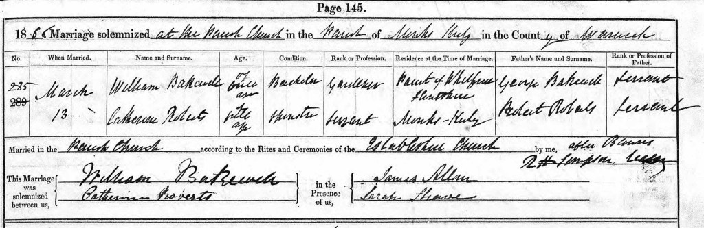 It was there, in Monks Kirby, that Catherine met William Bakewell. He worked as a gardener, while Catherine worked as a servant. Both were unmarried and building their lives through hard work and service. On 13 March 1866, William, aged 24, married Catherine, aged 28. Soon after their marriage, the couple moved to Whitford in Flintshire, Wales, where William found work as a gardener.