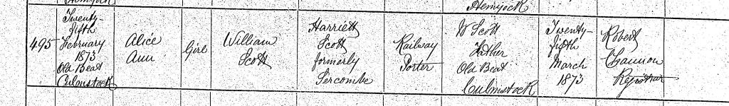 Beatrice Annie Scott was born on 1 February 1883 in Burlescombe, Devon. She was the daughter of William Scott (born December 1842 in Burlescombe) and Harriet Larcombe (born 12 November 1844 in Nettlecombe, Somerset).