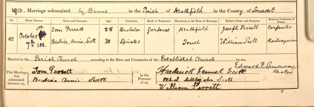 On 7 October 1913, at the age of 30, Beatrice married Tom Perrett in Heathfield, Somerset. The marriage was also registered in Taunton in October 1913.
